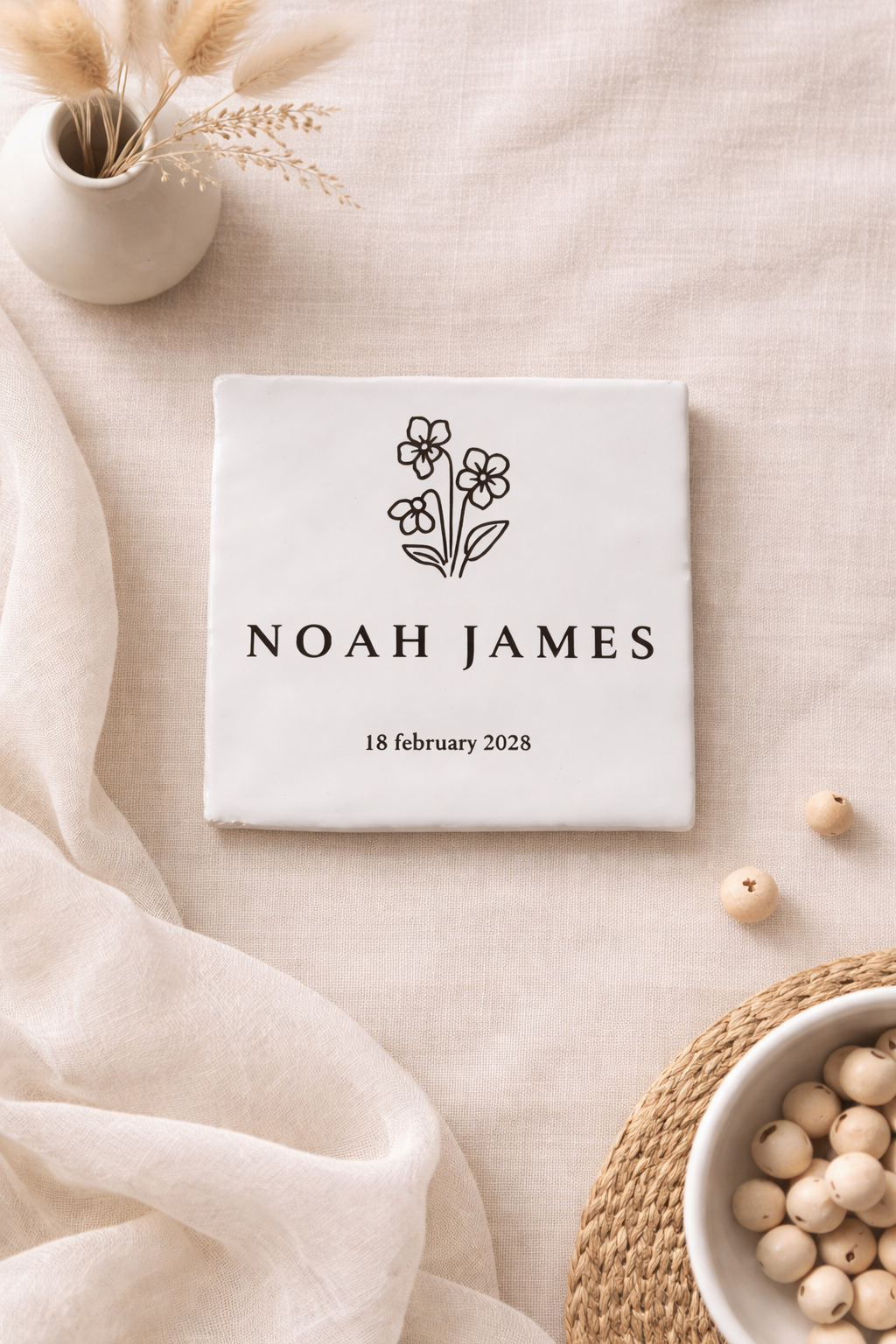 Een minimalistisch tegeltje met naam, datum en geboortebloem — een blijvende herinnering aan een bijzondere dag.
